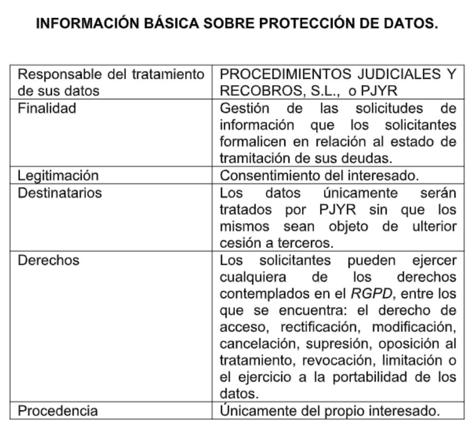Así, tanto los datos que PJYR recoge, como aquellos que se originen, se recaben o se puedan facilitar a lo largo de la relación establecida con los solicitantes, son aquellos necesarios e imprescindibles para poder atender la solicitud y gestionar, en su caso, una solución que permita liquidar la deuda del solicitante, todo ello en desarrollo del objeto social de PJYR, y en consonancia con el principio de minimización de datos.